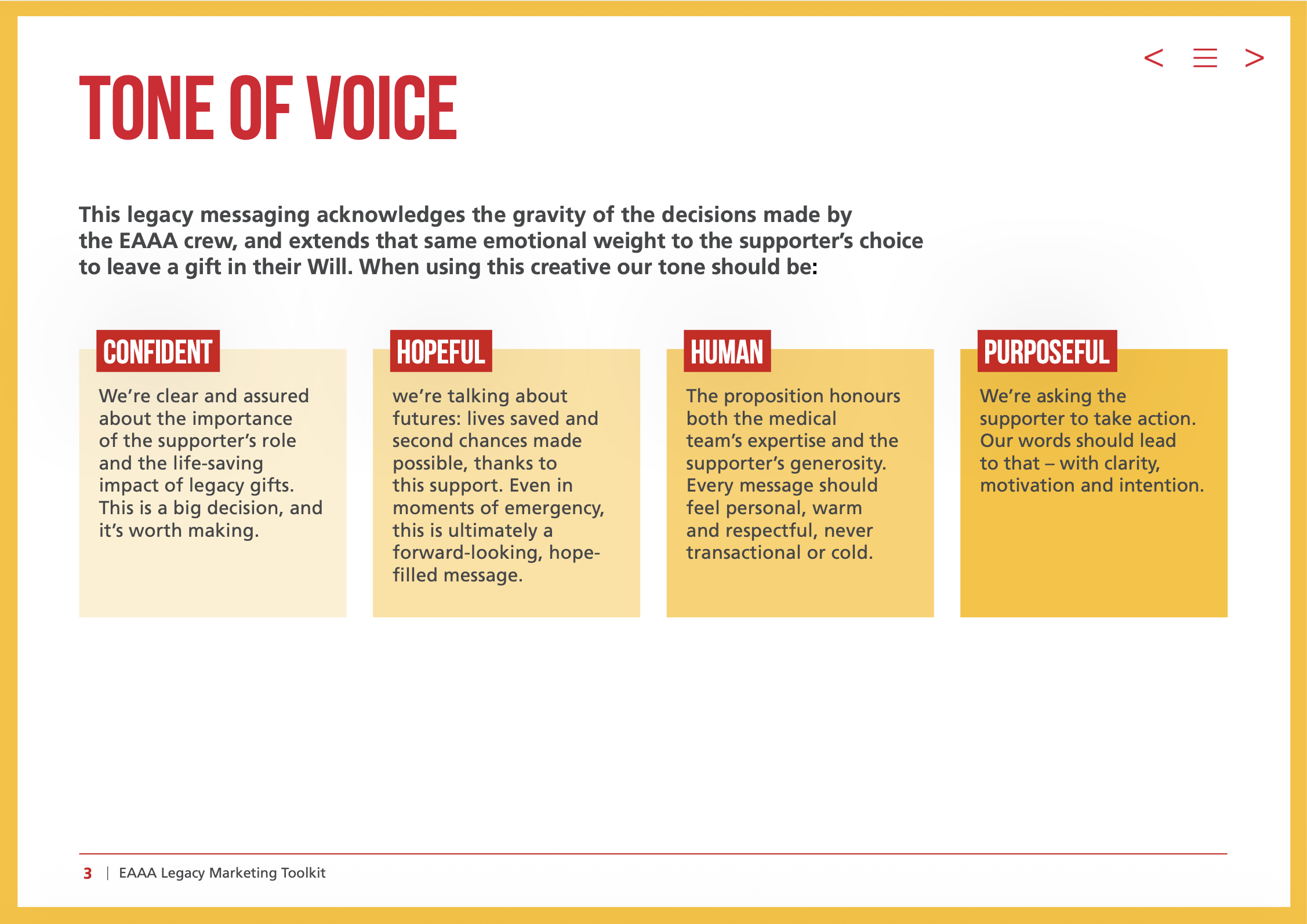 We also created a stewardship toolkit showing how EAAA could adapt messaging across the supporter journey, building long-term confidence and consistency around legacy giving
